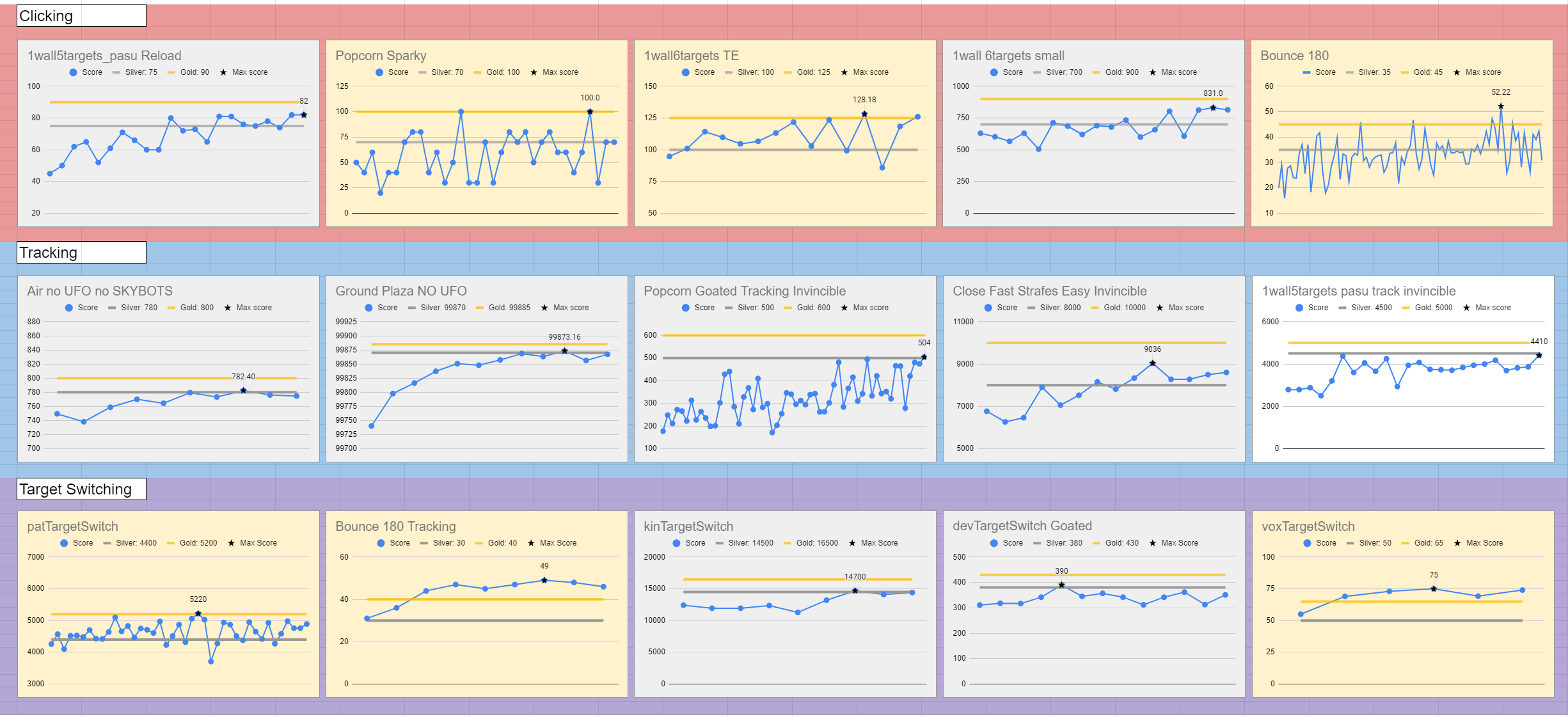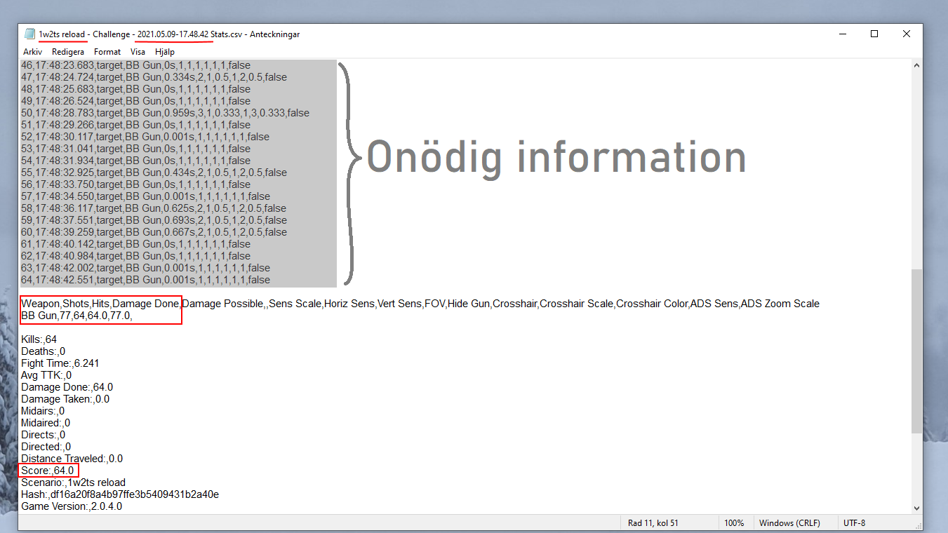 I fps-trainern Kovaak skapas det en logg i .csv-format för varje utmaning man spelar, där det går att se träffsäkerhet, skada, poäng m.m. Den registrerar dock väldigt mycket information, vilket gör att om man importerar datan till excel för att plotta endast träffsäkerhet och poäng, så är det svårt att välja ut rätt data.