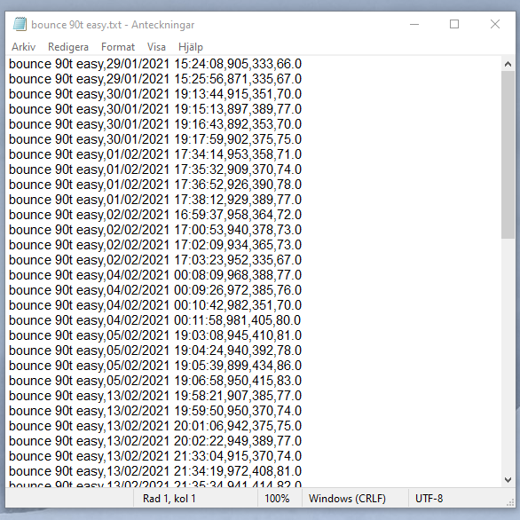 Sedan sattes allt ihop till ett antar loopar som gick igenom varje fil i mappen en efter en, och plockade ut de olika värdena, dels från filnamnet, dels från texten i filen. Det krävdes lite pyssel för att matcha till rätt värde i filen, men till slut så gick det att få ihop till ett fungerande program.